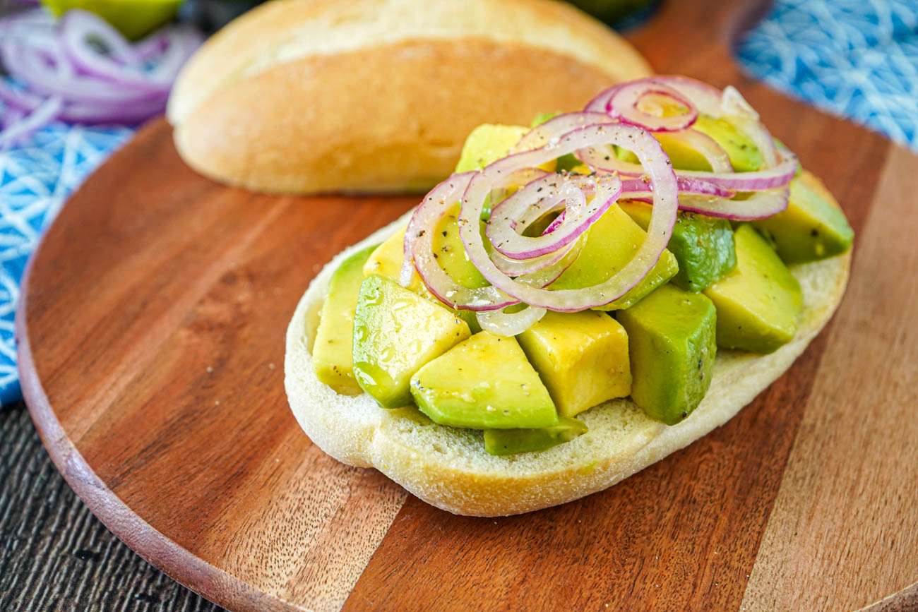 A recipe for Pan con Aguacate (Avocado Sandwich)! Pieces of lightly seasoned avocado are arranged on a roll with pickled red onion.