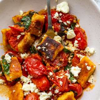 {See video below} Soft fluffy gnocchi, pan fried in butter to create a beautiful golden crust then tossed with roasted pumpkin & spinach in a butter sauce. I use pumpkin to fill out this recipe because it has far less calories than gnocchi for the same weight and it adds a gorgeous flavour to this dish!