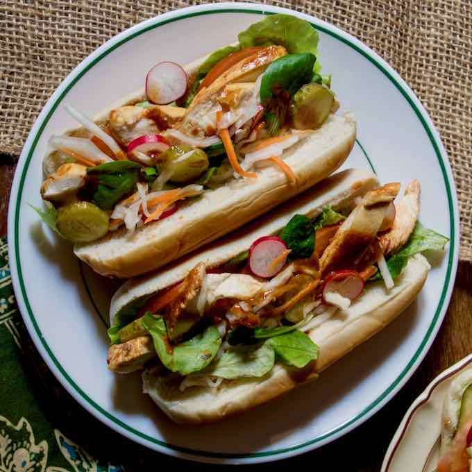 - Verser une cuillère à soupe de sauce sur la dinde et ajouter laitue, cresson, cornichon, radis, et tomate. Ajouter également un peu de légumes préalablement marinés.