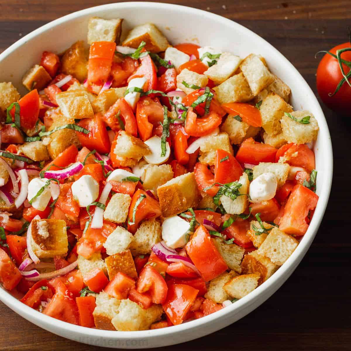 Panzanella Salad with crusty bread, juicy vine-ripened tomatoes, and the best homemade vinaigrette dressing.