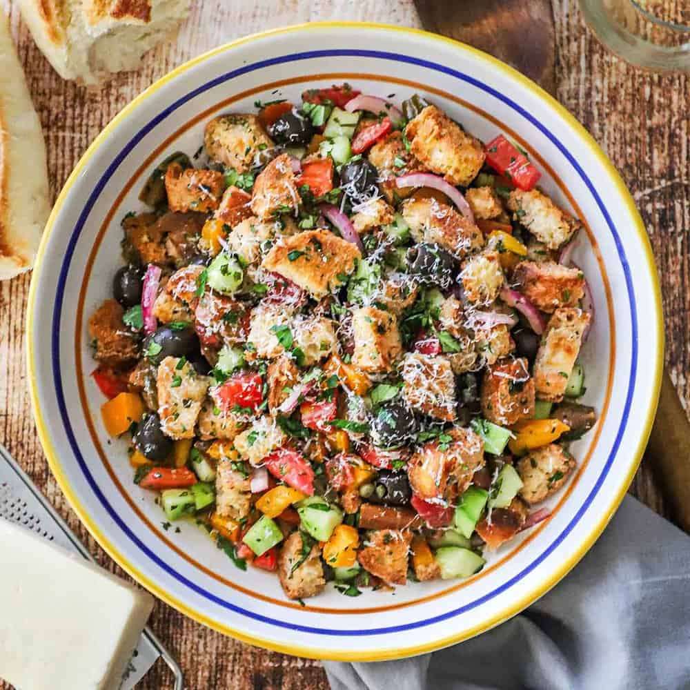 Panzanella (Tomato and Bread Salad) is the perfect salad for peak-season tomatoes. You could go with stale bread pieces, but we find that making our homemade croutons put this salad over the top.