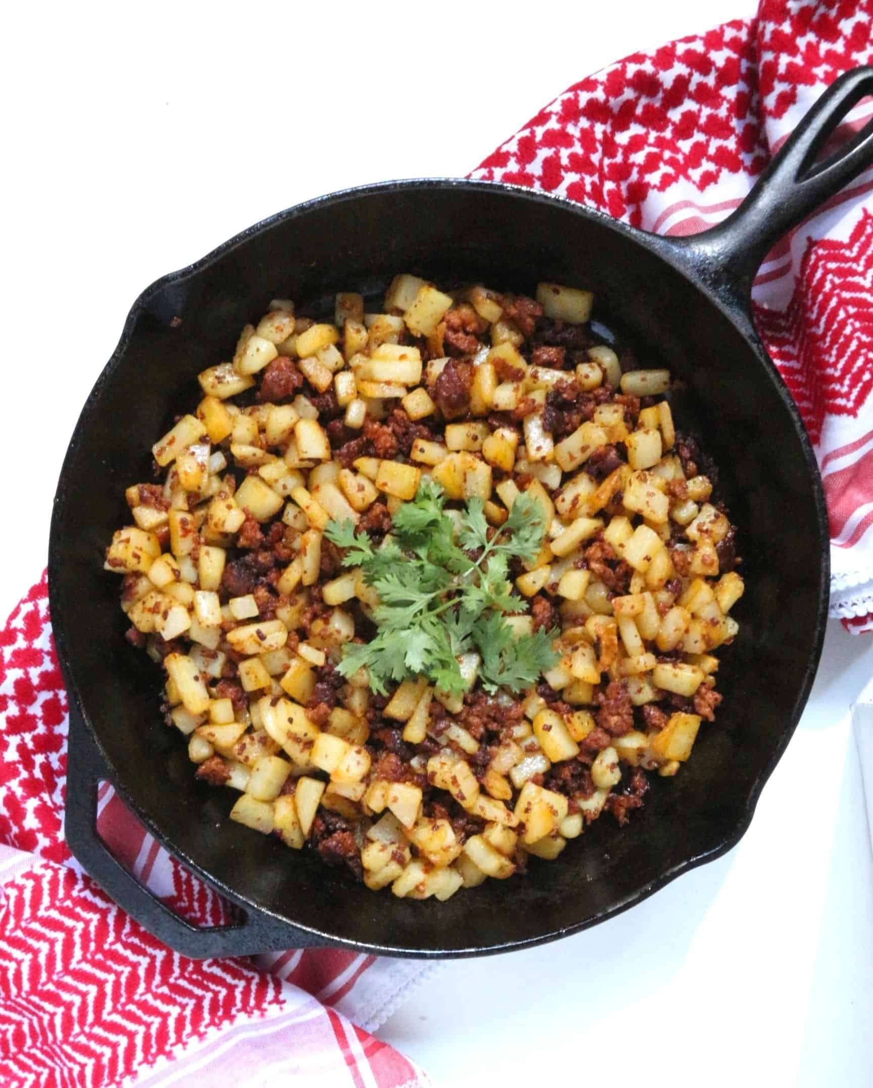 Papas con Chorizo (Potato with Mexican Sausage), an easy two-ingredient Mexican dish usually served for breakfast, brunch, or lunch with a side of eggs or refried beans or stuffed inside a burrito or gordita.