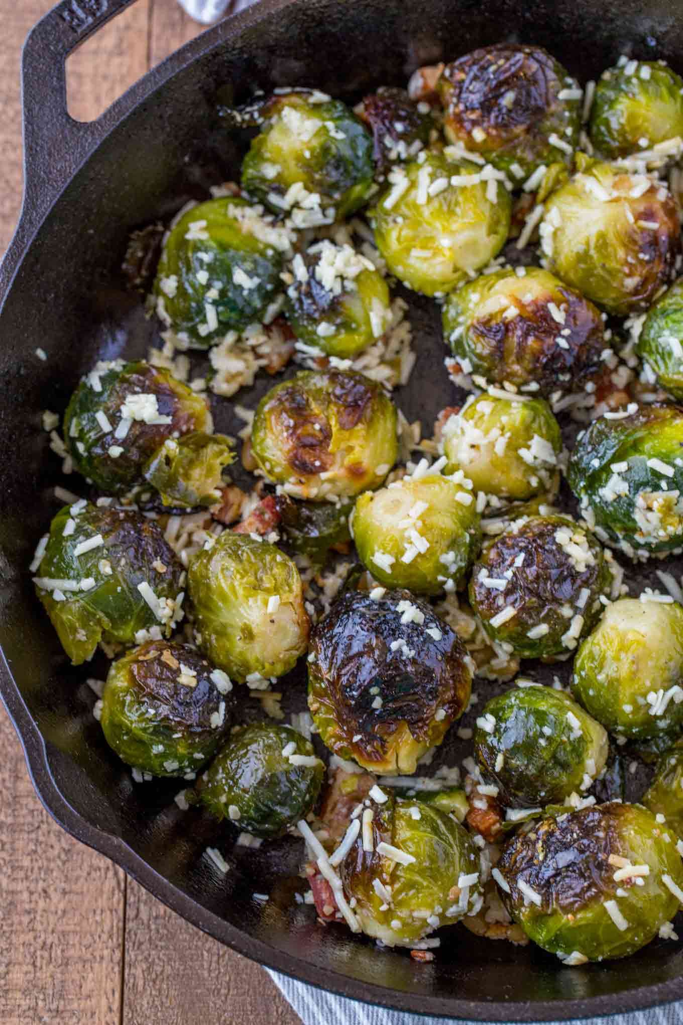 Roasted Brussels Sprouts in a cast iron skillet and topped with Parmesan cheese and crumbled bacon are the perfect holiday side dish you can make in one pan in 30 minutes.