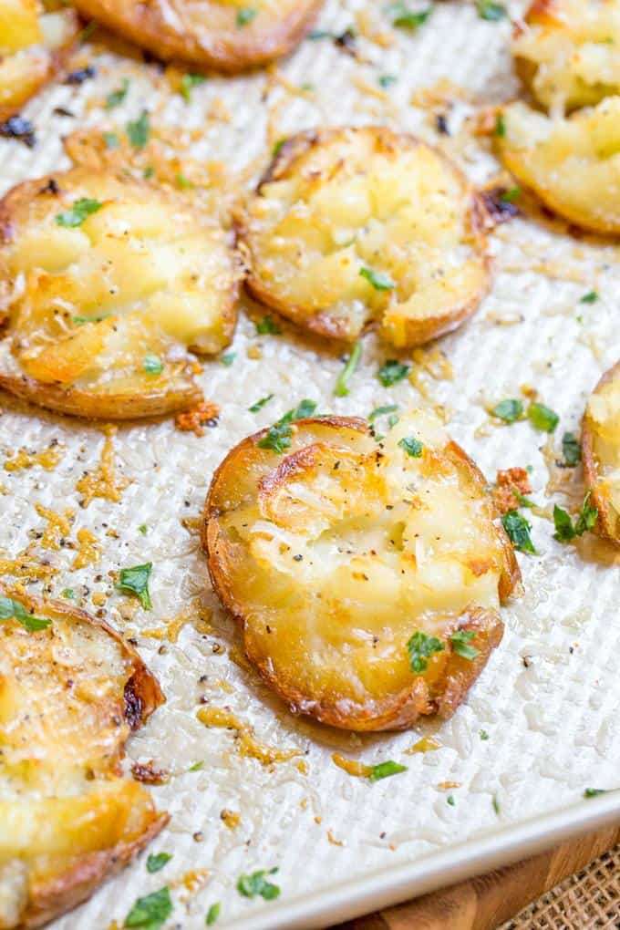 Parmesan Garlic Crash Hot Potatoes are crispy, creamy, cheesy and garlicky. Made in one pan, there is no boiling necessary and they make the perfect holiday side dish.