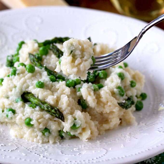 This Parmesan, Peas and Asparagus Risotto is creamy, rich, decadent and full of delicate flavors. This easy risotto recipe is made the way Chefs make it in restaurants. No constant stirring required, no guessing how much broth to add, yet it produces perfect creamy risotto every time!