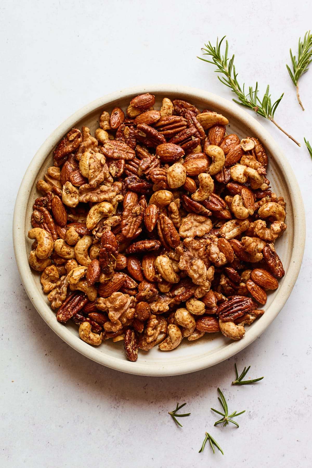 These sweet and savory party nuts are lightly sweetened, have a touch of spice and are absolutely addicting. They are the perfect snack to serve at a holiday party or make for an easy DIY gift.