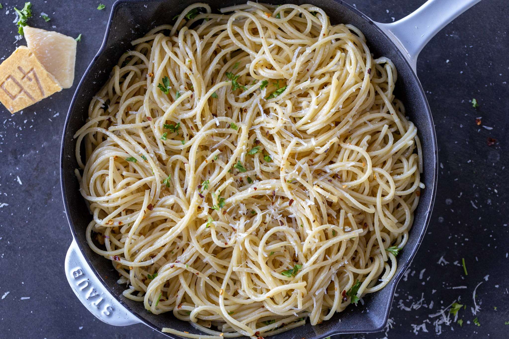 This pasta aglio e olio recipe consists of spaghetti tossed in a garlic, olive oil, and red pepper flake sauce. You won't believe how easy it is to make!