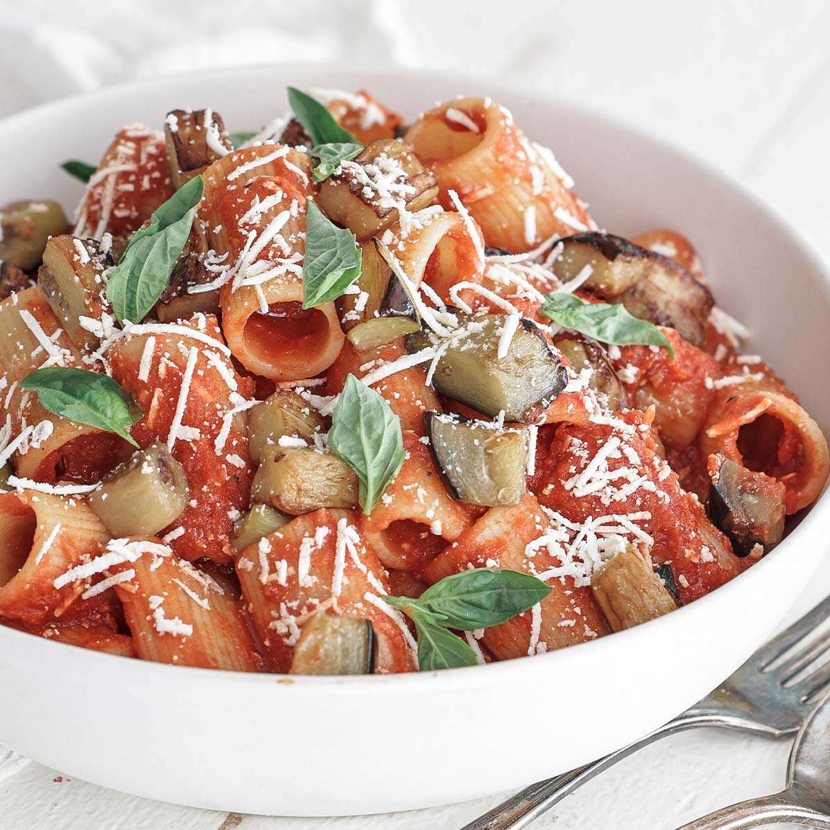 This Pasta alla Norma Recipe of simmered tomato sauce with fried fresh eggplant, cheese, and basil is beyond delicious and easy to make.