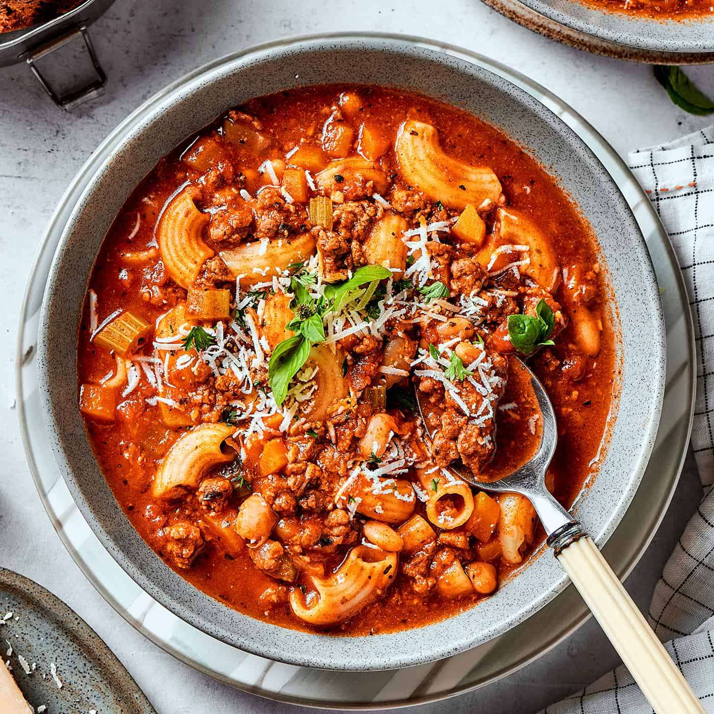 This easy Italian-inspired Pasta Fazool recipe pairs tender pasta, creamy white beans, and ground beef in a savory tomato-based broth. It's a one-pot, one-bowl meal dressed with salty cheese and fresh herbs for even more flavor!