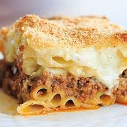 A classic pastitsio recipe - layers of ziti pasta with a beef and lamb sauce, bechamel and loads of cheese!
