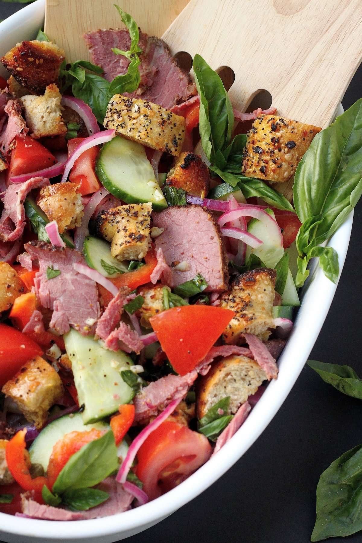 - At this point drain the onions, then add them to the tomato mixture, along with the red peppers, cucumber, basil leaves, capers, and pastrami.