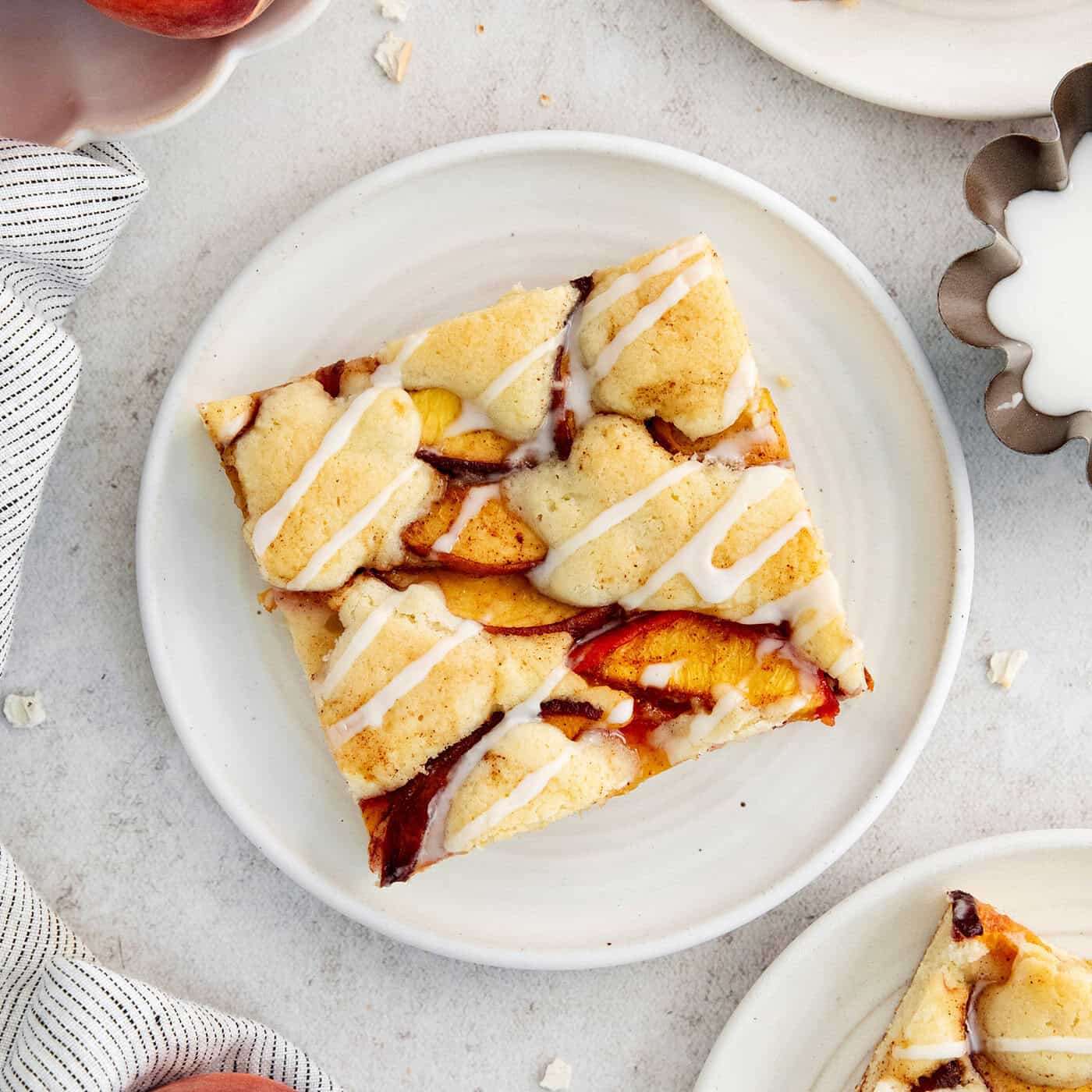 This easy Peach Bars recipe features a tender, buttery base that's flavored with almond and topped with sweet, juicy peaches. Finished with a drizzle of sweet almond glaze, this is a favorite summer treat!