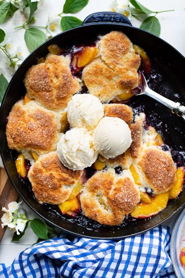 This Southern Peach Blueberry Cobbler is the best way to enjoy fresh summer fruit! Don't forget a scoop of vanilla ice cream on top for a classic, old-fashioned treat!
