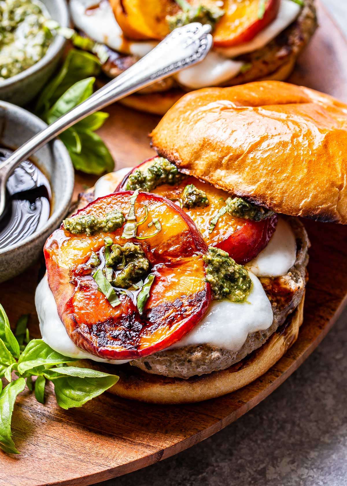 - Place the burgers on the bottom half of the buns. Top with a couple of the sliced peaches, chopped basil and a drizzle of balsamic glaze and pesto.