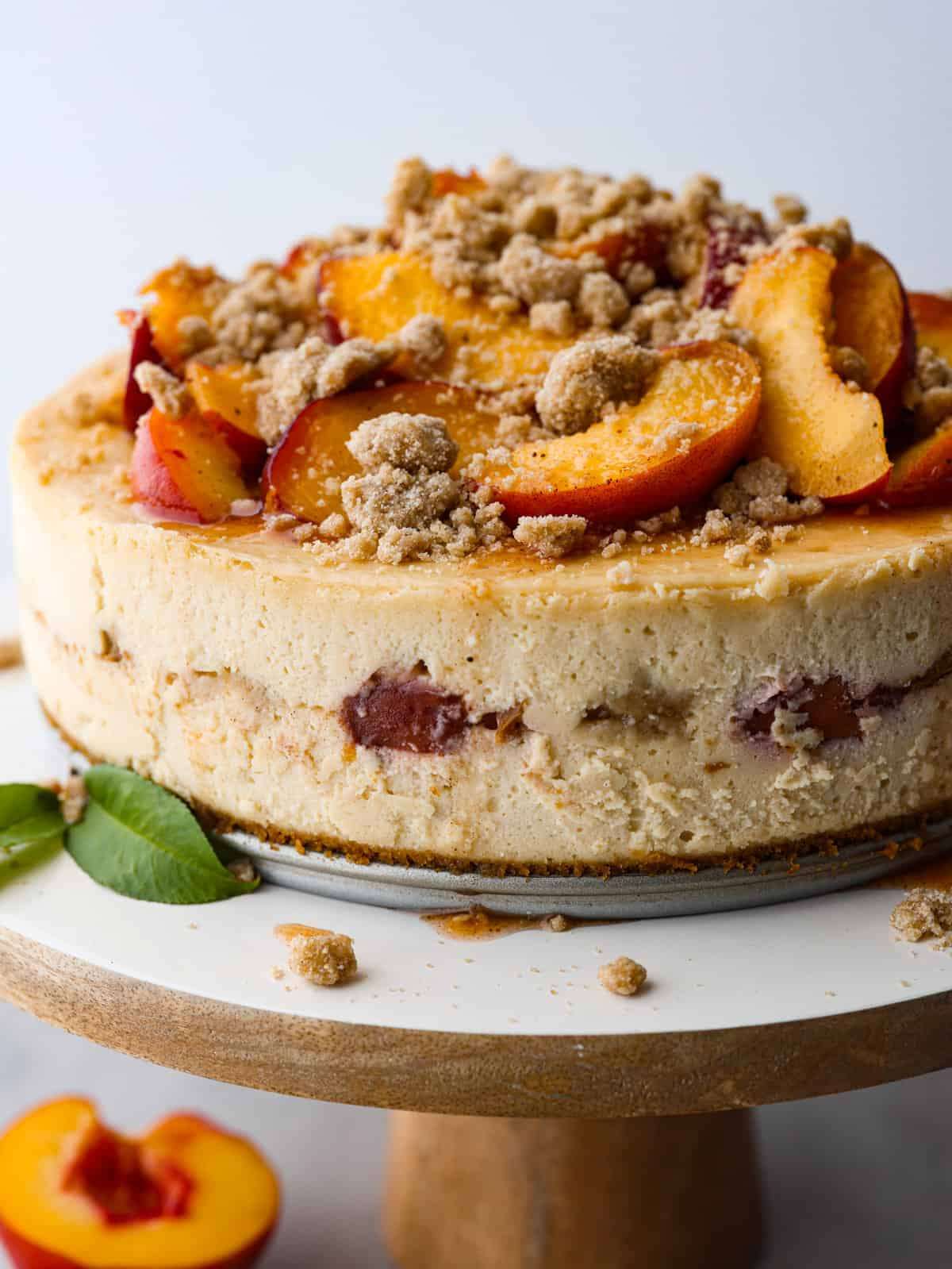 - Chill in the fridge for 4-6 hours or overnight. Before serving, top the cheesecake with the remaining roasted peaches and streusel. Drizzle with the reserved peach syrup, if desired.