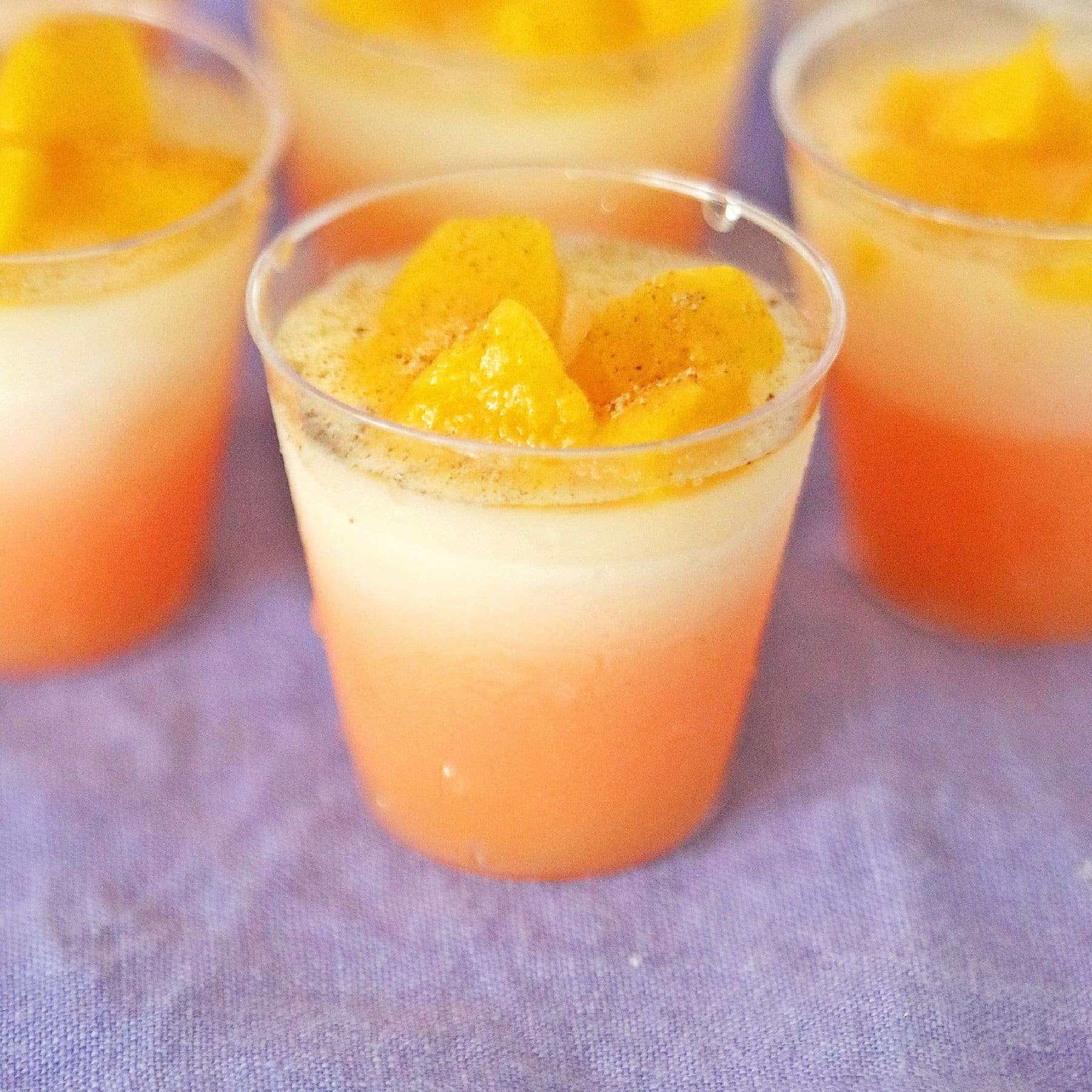 - Place a teaspoon of Diced Peaches on the top of each Shot Glass before serving.