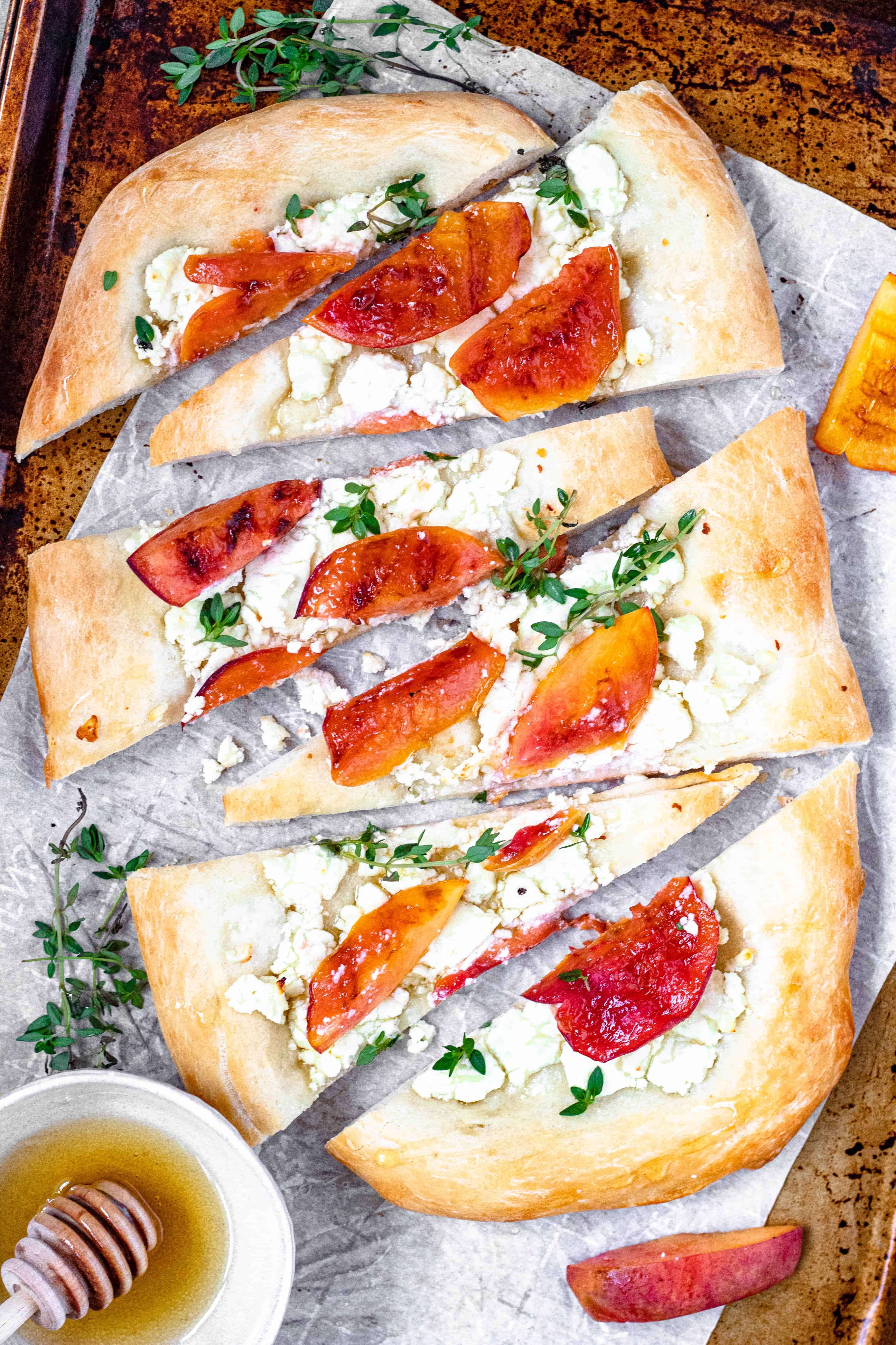- When the flatbread comes out of the oven, top it with the grilled peaches and 2 tsp fresh thyme. Then drizzle 2-3 tsp honey over the entire flatbread.