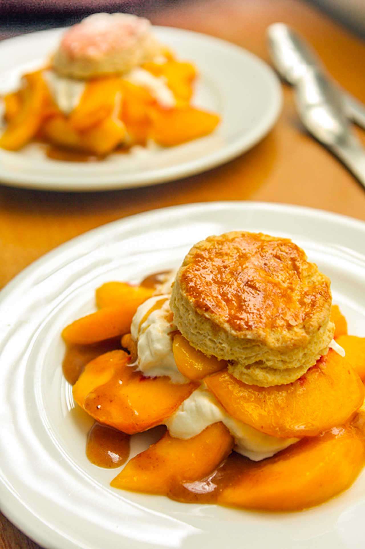 - To assemble the shortcakes, cut each biscuit in half and place the bottoms on six plates. Divide the peach coulis amongst the biscuits, pressing it in a bit with a spoon to encourage the juices to saturate the biscuit. Add a few peach slices on top of each, then add a generous dollop of cream. Finish with the rest of the peach slices and top with the crown of the biscuit. Drizzle with warm butterscotch sauce.