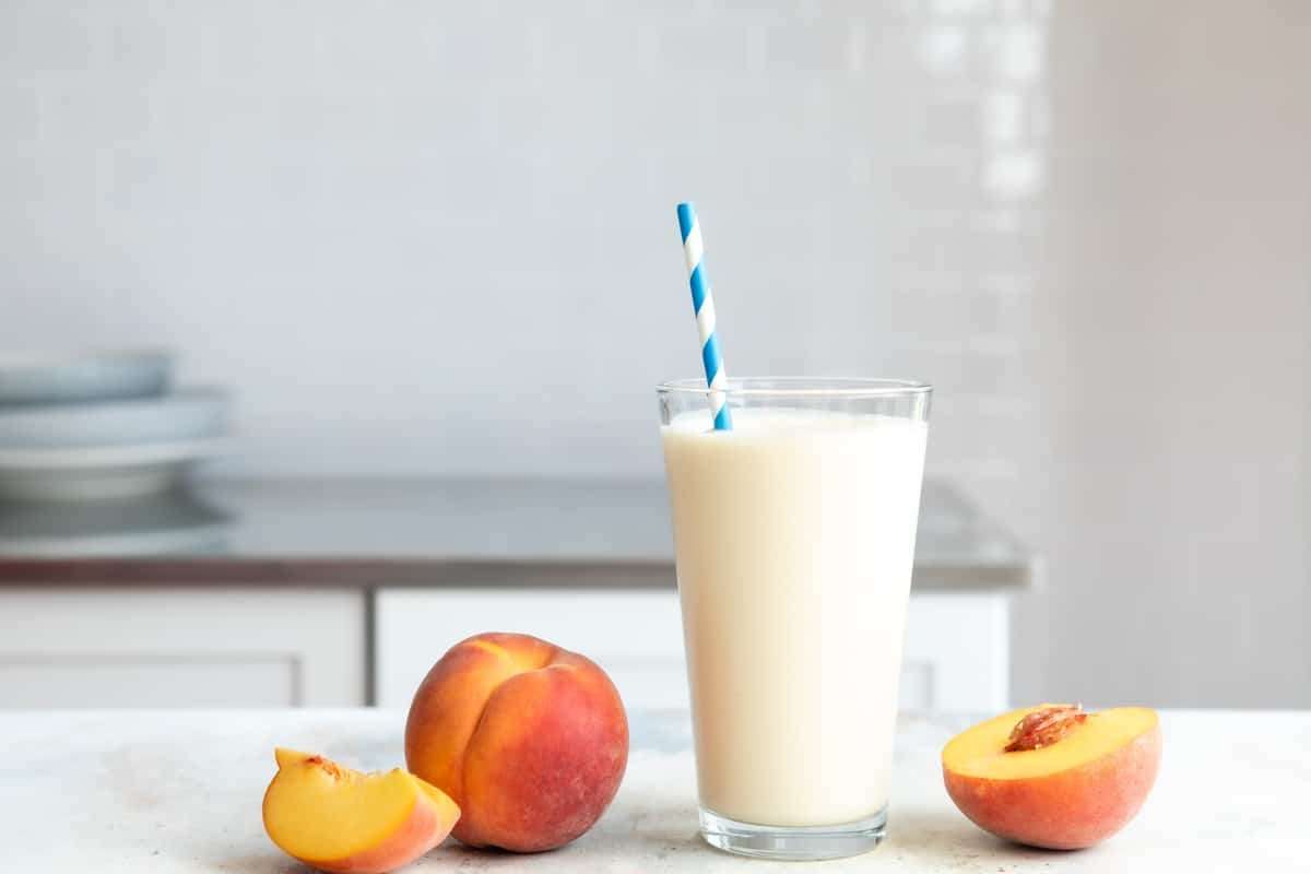 - In the bottom of a blender, add almond milk, peaches, protein powder or Greek yogurt, and vanilla extract. Blend until smooth. Taste and add honey if desired.