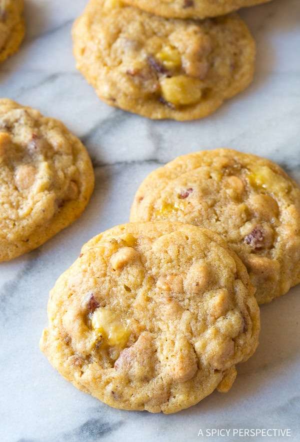 Elvis Cookies Recipe - Moist and tender cookies with chunks of fresh banana, peanut butter chips, and bacon. Lord Almighty, I feel my temperature rising!