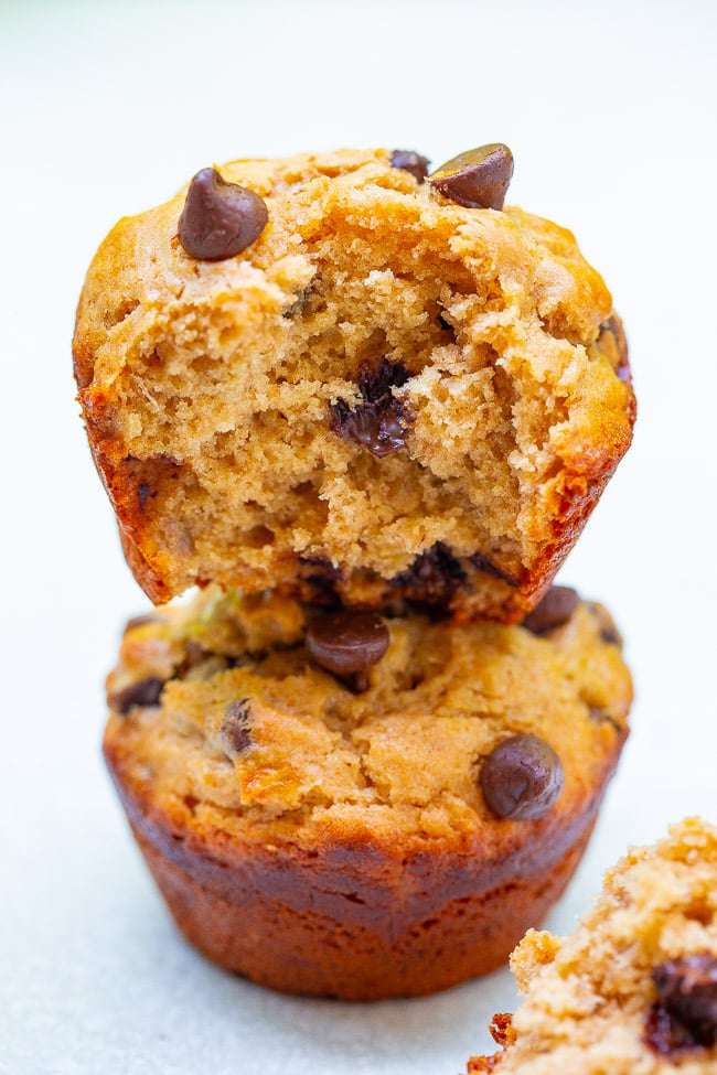 🥜🍌🍫 Loaded with rich peanut butter and banana flavor and studded with chocolate in every bite! This FAST and EASY muffin recipe is one bowl, no mixer, and perfect for those ripe bananas you have!