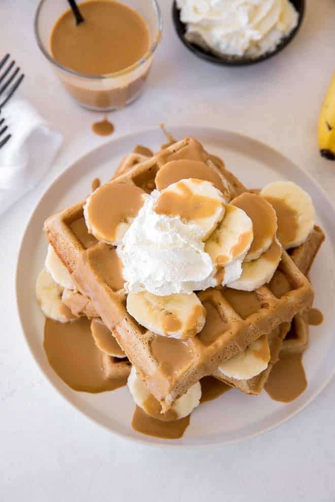 - In a medium bowl, whisk together the PB2 powder and water to make the peanut butter syrup. Drizzle over the waffles and top with sliced bananas and whipped cream.