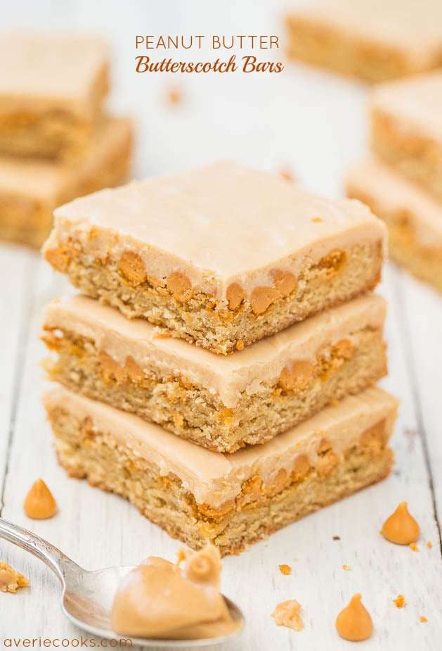 Peanut butter and butterscotch is such an awesome flavor combination. The butterscotch flavor is prominent and really shines. Sweet with a bit of saltiness, caramely, and buttery. If you’re a fan of butterscotch, you’ll love these. The bars are soft with slight chewiness and texture from the oats. The peanut butter frosting is thick, luscious, rich, creamy, and you’ll be tempted to eat the whole bowl before it even makes it onto the bars. Make the frosting while the bars bake and add it right as the bars emerge from the oven. The bars taste much more complicated than the simple, everyday ingredients used.
