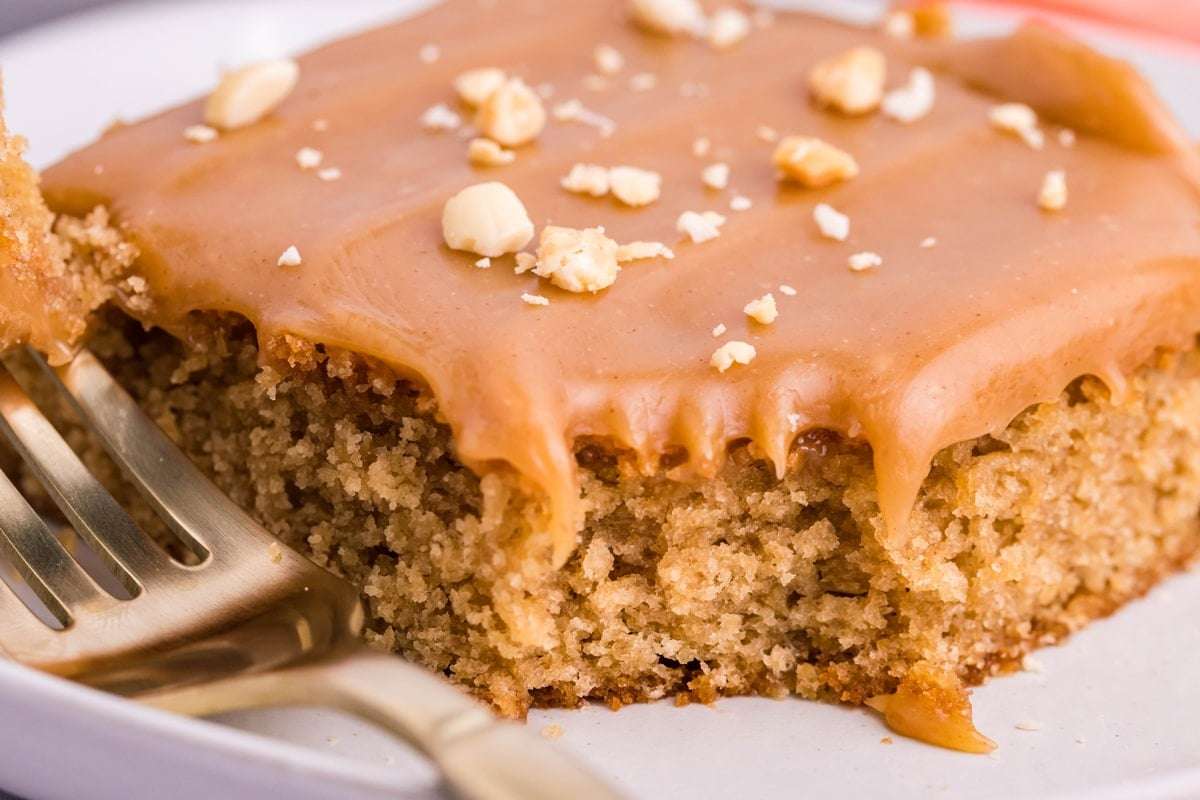 - Pour warm frosting mixture over the hot Peanut Butter Cake and spread around to cover fully. Sprinkle with honey roasted peanuts immediately while frosting is still tacky.