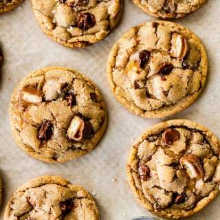 I combined three favorite recipes – Twix, Tagalongs Girl Scout Cookies, and Millionaire’s Shortbread in this these nearly no-bake, easy, four-layer bars. There’s buttery shortbread, rich and dense peanut butter, sweet and intense caramel, and smooth dark chocolate. They hit all my favorite elements of a dessert all in one. Buttery, snappy, creamy, smooth, peanut buttery, dense, rich, gooey, velvety, and chocolaty. They’re like a marriage of Peanut Butter Twix and Tagalongs, in bar form, and they’re irresistible!