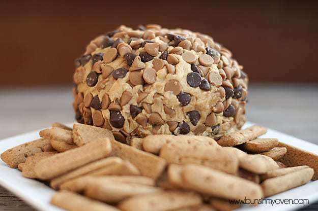 This cheese ball recipe is made with peanut butter and chocolate chips for a sweet twist on cheese balls! Such a fun snack to serve to party guests.