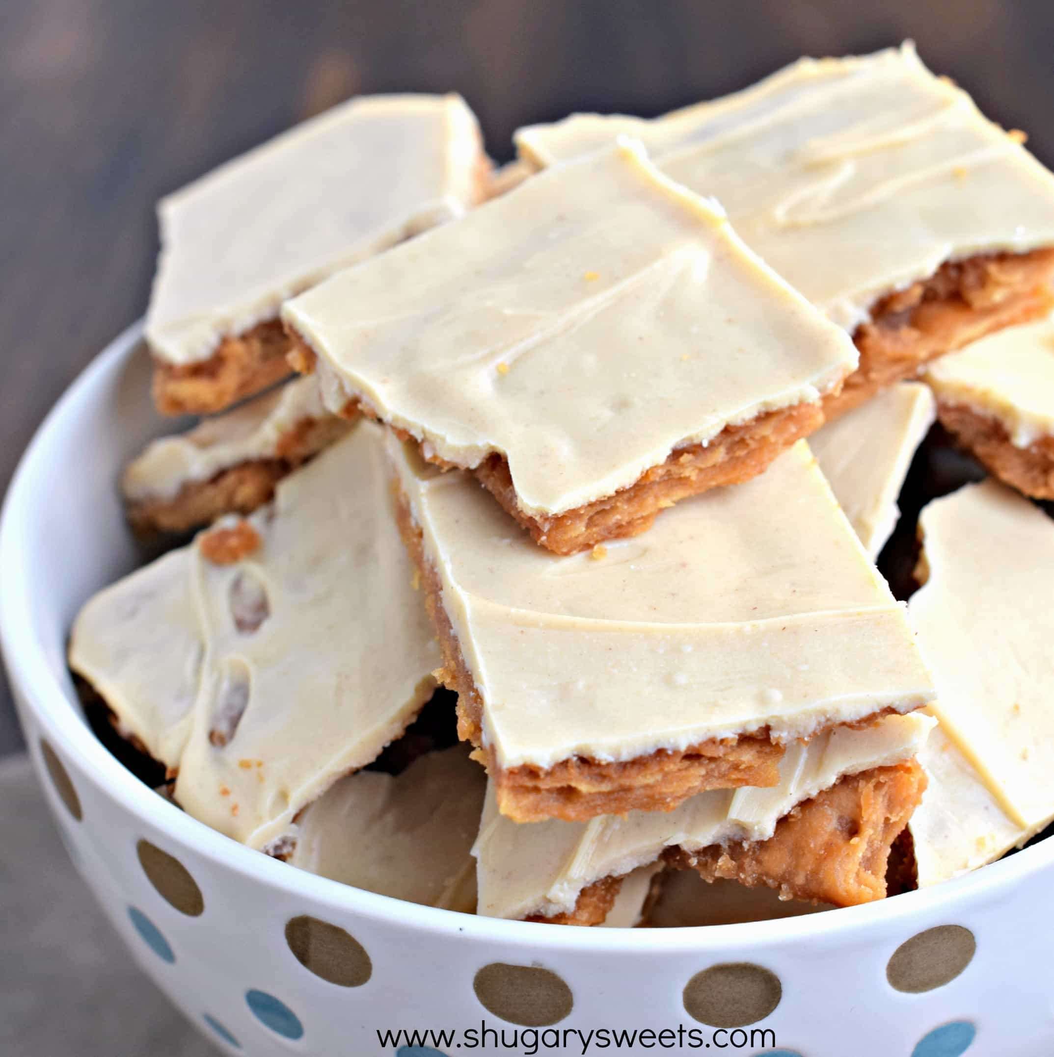 - In a small, microwave safe bowl, combine white chocolate chips with remaining 1/4 cup peanut butter. Microwave for one minute, stir until smooth. If not completely melted, heat for 15 second intervals, stirring each time to test for smoothness. Pour over slightly cooled (they can still be a little warm) toffee.
