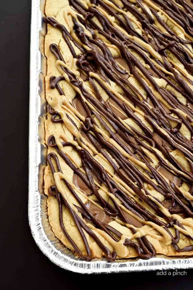 - Drizzle top of the baked and cooled peanut butter cup blondies with melted chocolate and then with melted peanut butter.