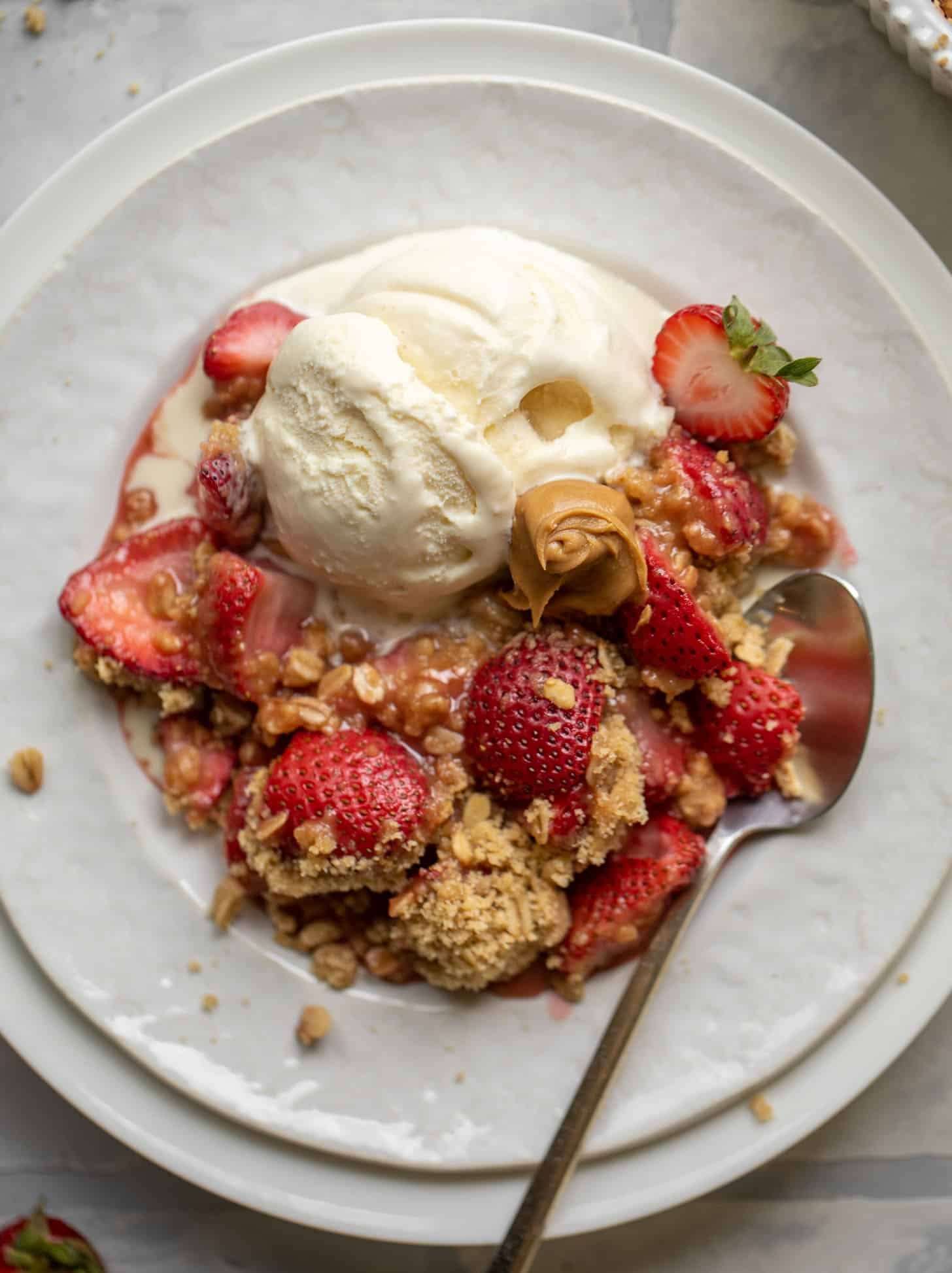 - Bake for 35 to 40 minutes, until the fruit is warm and syrupy and the topping is golden brown. Serve warm with vanilla ice cream and a dollop of creamy peanut butter. If desired, you can sprinkle peanuts on top too!