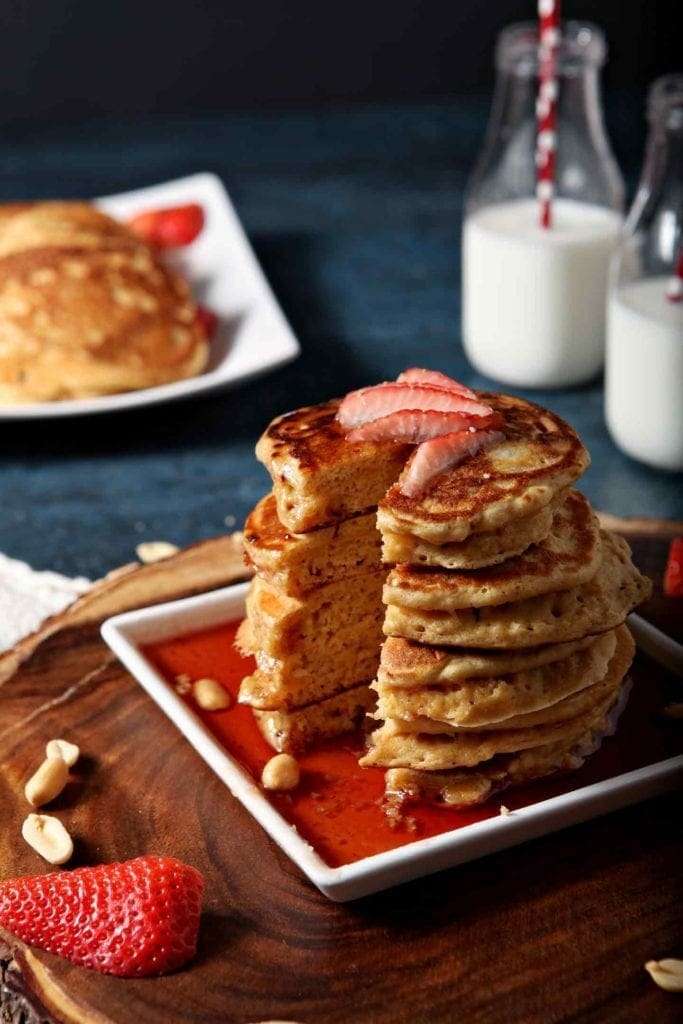 Peanut Butter Pancakes with Raspberry Preserves Syrup make the ultimate breakfast treat! These homemade pancakes, made with peanut powder, are fluffy and flavorful! The homemade raspberry syrup adds a lovely balanced sweetness. Tasting similar to a classic PB&J, these homemade pancakes are sure to make any day delicious!
