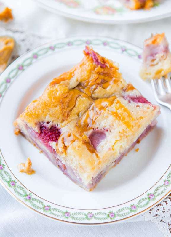 - Gently and briefly fold the fruit into batter. I used frozen berries and added them frozen; do not thaw because frozen fruit runs and bleeds less than if thawed. I let them warm up for about 5 minutes in order to slice them. If using fresh fruit, baking time will be significantly (possibly drastically) less because the fruit is much warmer and won’t chill down the batter overall, nor will it release any where near the water into the batter that frozen fruit does. Optionally, substitute cherries, blueberries, blackberries, raspberries, or peaches; fresh or frozen.