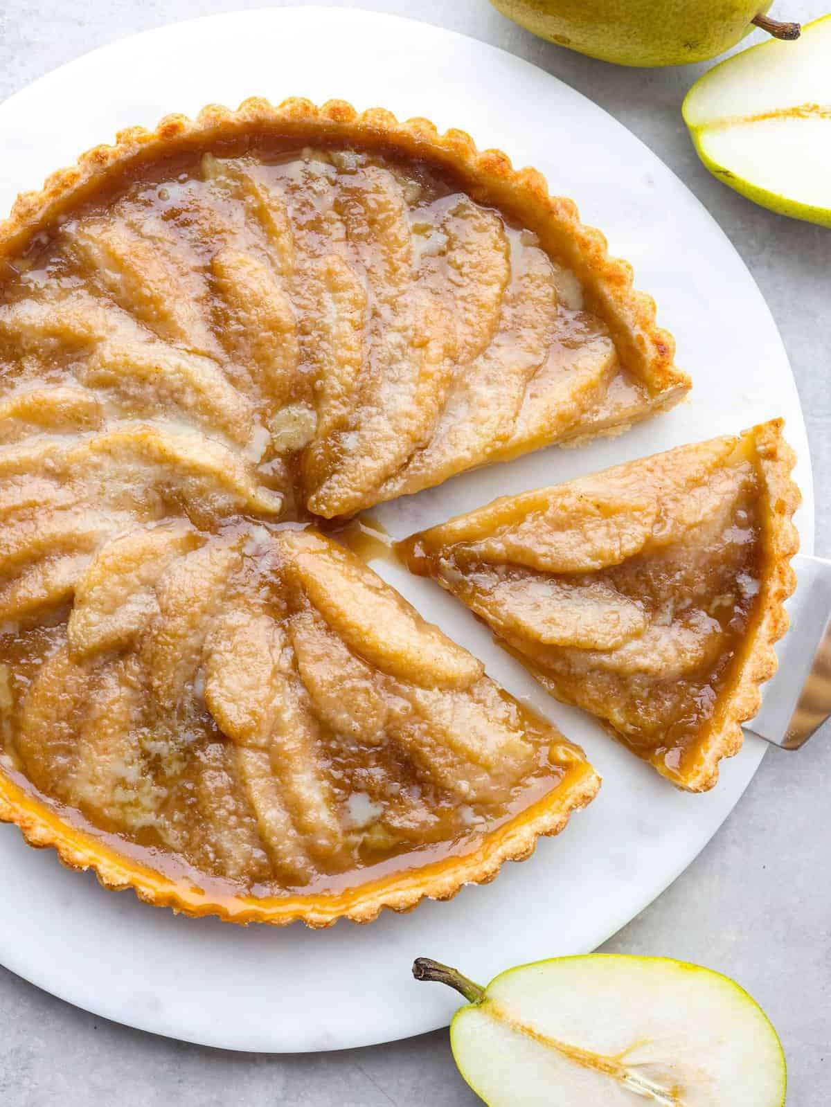 This pear tart is as delicious as it is gorgeous! It has a perfectly flaky crust topped with sliced pears and covered with a delightful brown sugar crumb topping.