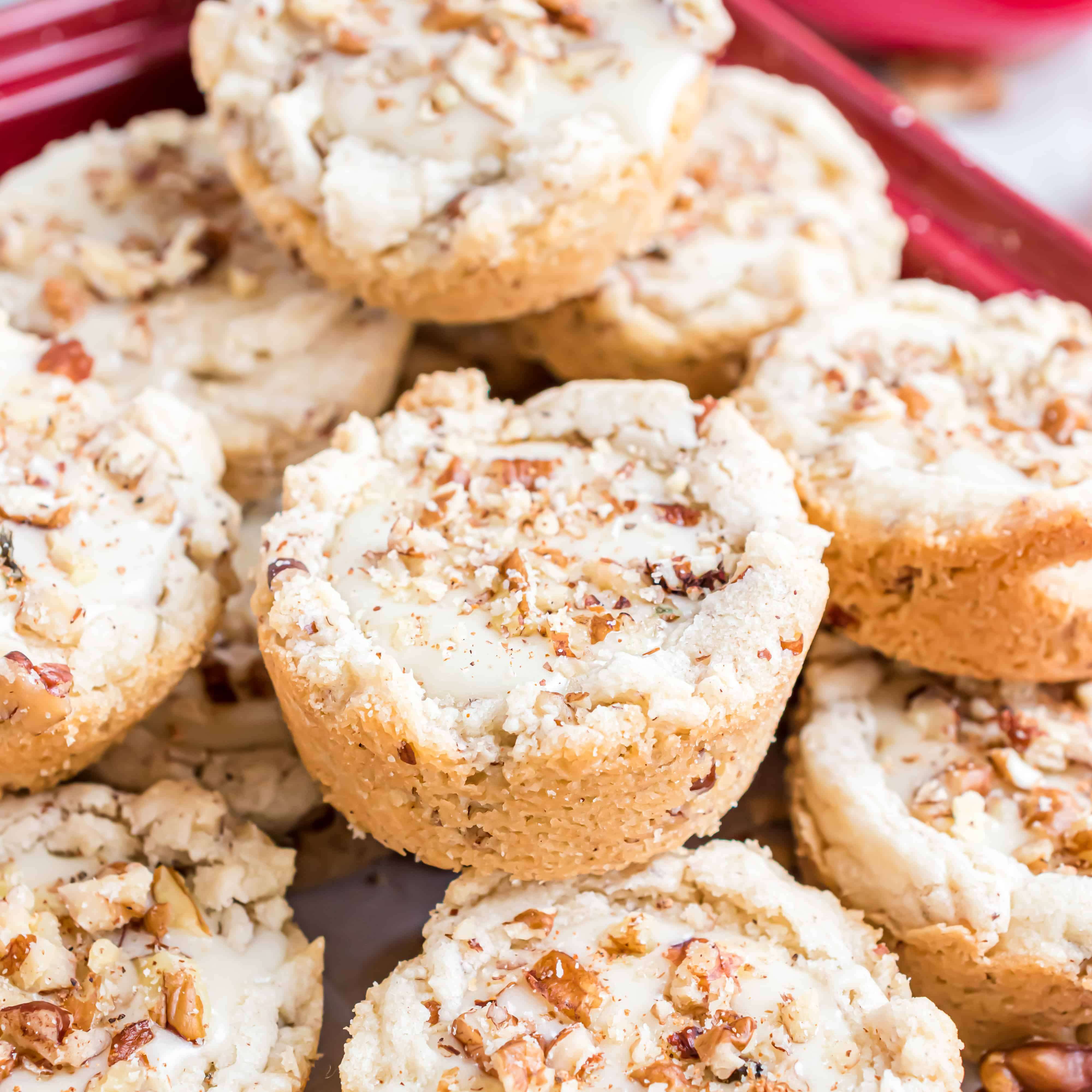 - For the glaze, whisk together the powdered sugar with egg nog until combined. Drop a small teaspoon on top of each cooled cookie cup. Immediately sprinkle with chopped pecans and a pinch of nutmeg. Allow to set, about 15 minutes. ENJOY!