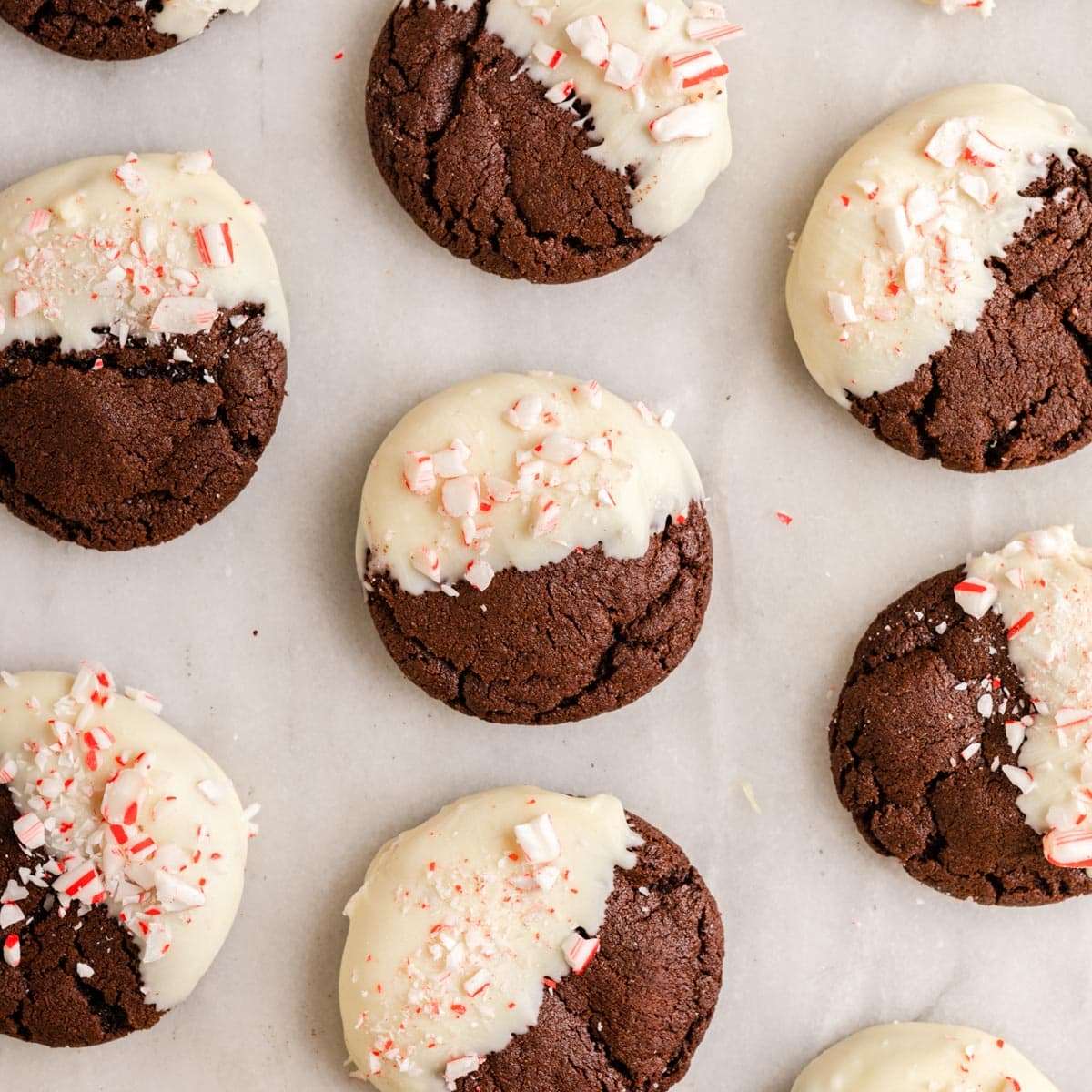 Peppermint Bark Cookies are the perfect holiday cookies! Chocolate cookies dipped in white chocolate with crushed peppermint candy topping.