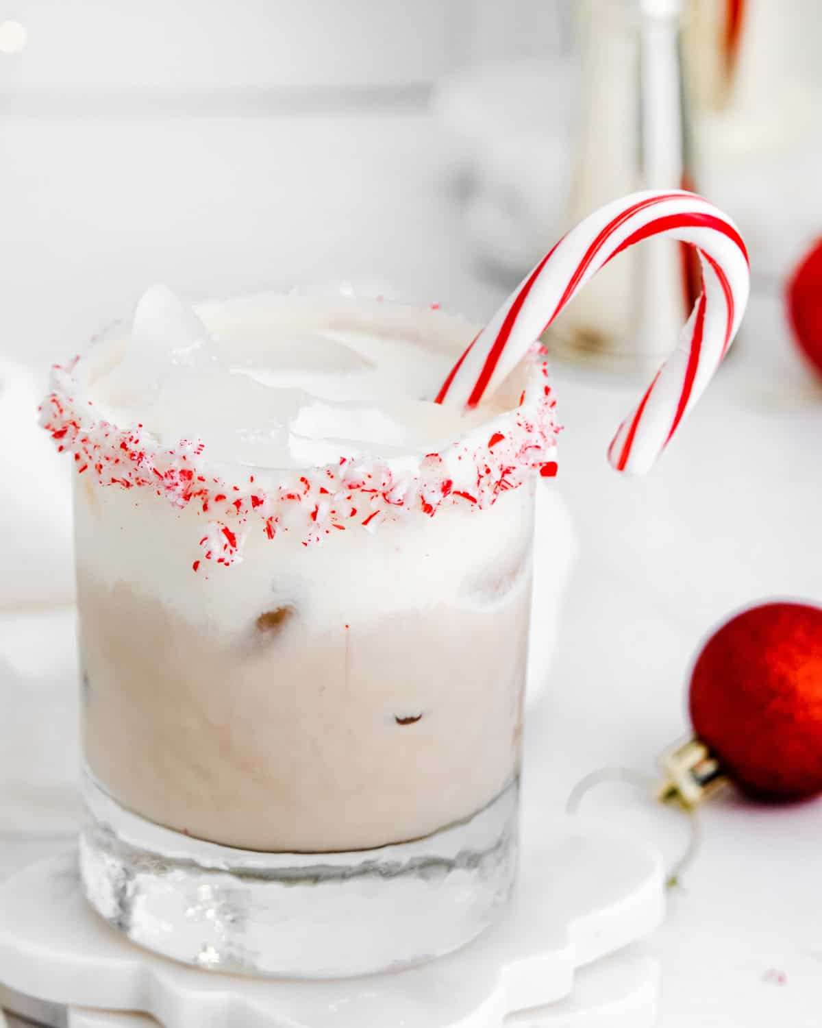 - Strain into a rocks glass. Garnish with a candy cane, if desired. Serve immediately.
