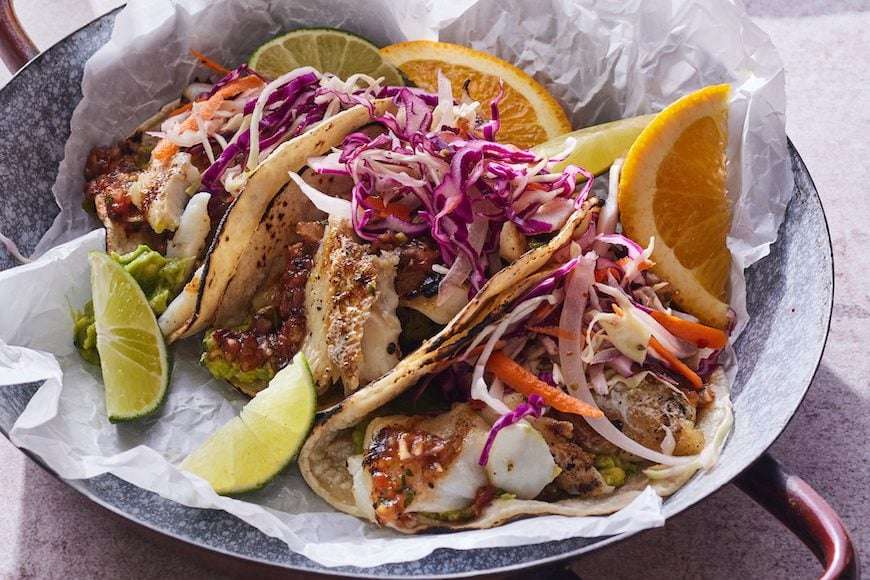 - To assemble, place a few large pieces of the flaked fish into a warmed tortilla, Top with a spoonful of guacamole, a bit of salsa and 2 tablespoons of the curtido. Serve immediately.