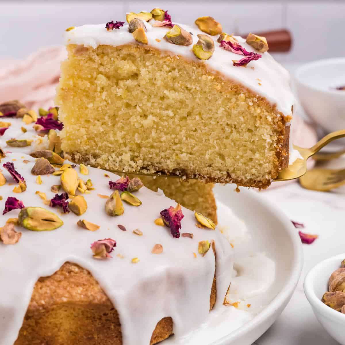 - Drizzle the glaze over the cooled cake. Decorate with the chopped pistachios and dried rose petals, if using.