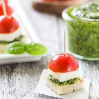 - To assemble the bites, generously spread 1 tablespoon pesto on each Wasa Crispbread. Top with 2 slices mozzarella, 2 slices tomatoes and basil leaves. Drizzle with balsamic reduction.