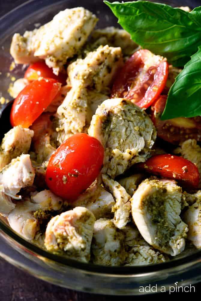 - Once chicken has cooled, pull chicken off the bone, discarding the skin and the bone of the chicken. Place chicken into a medium to large bowl. Add tomatoes and pesto. Stir until well combined.