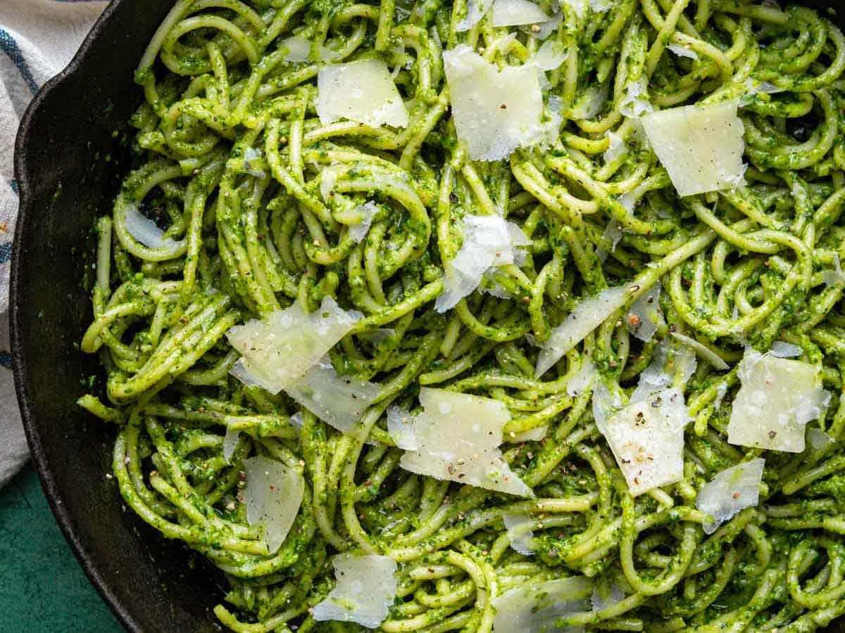 Pesto Pasta is a classic Italian dish that's easy to master. Enjoy noodles topped in a homemade pine nut, garlic, basil and parmesan sauce.