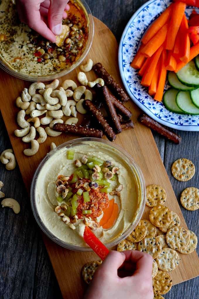 After this easy pickled celery, toasted hazelnut and pesto hummus recipe (seriously…yum!), you may never want to move on to dinner! I could eat this all night.
