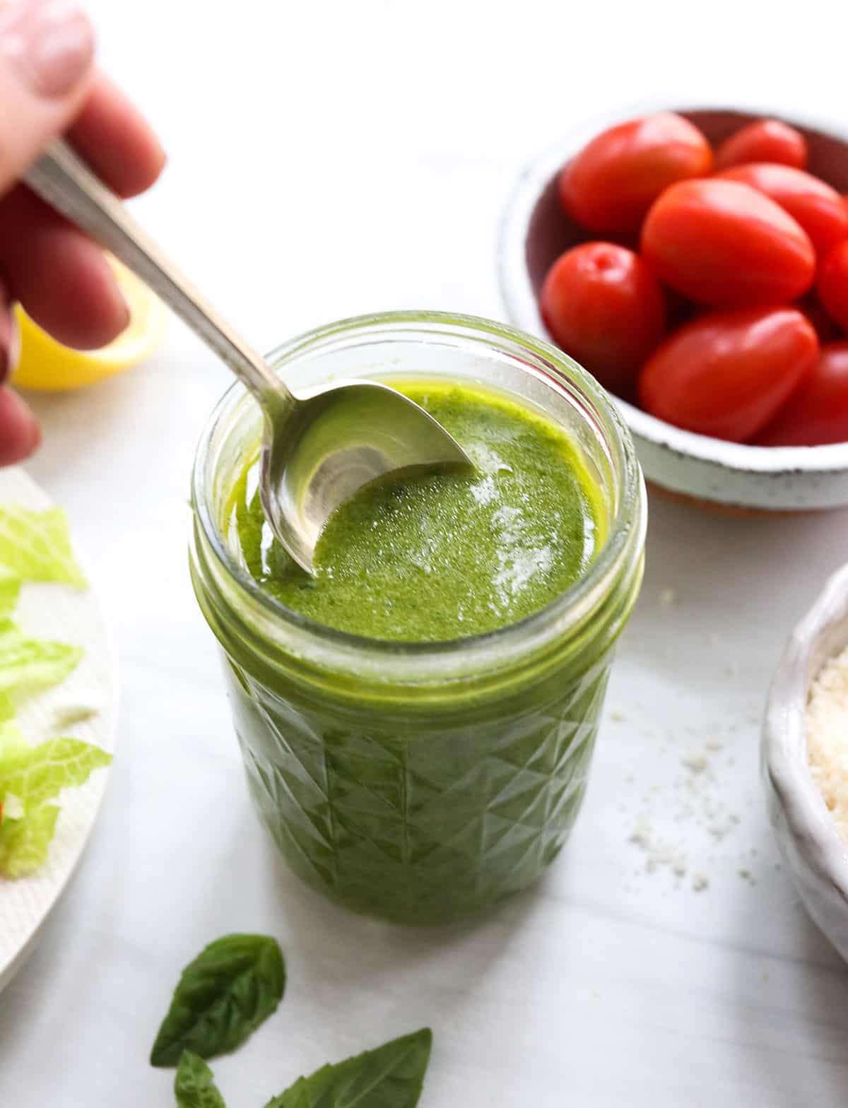 This Pesto Vinaigrette is super-easy to make, and will add a bright, fresh flavor to your next salad. It's also delicious over roasted veggies, pasta, chicken, and more!