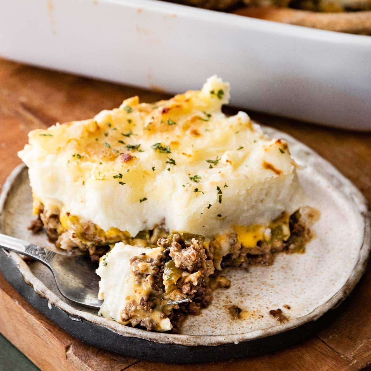 Philly Cheesesteak Shepherd's Pie is a comforting dinner version of Philly Cheesesteak with beef, peppers, mushrooms and cheese topped with mashed potatoes.