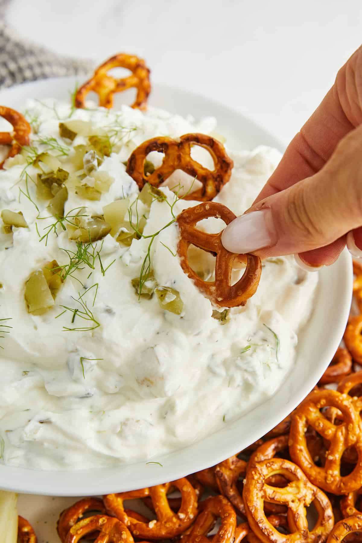 - Transfer the dip to a serving dish and garnish with additional dill weed if desired. Serve with veggies, chips or pretzels immediately. You can also refrigerate for an hour for best flavor.