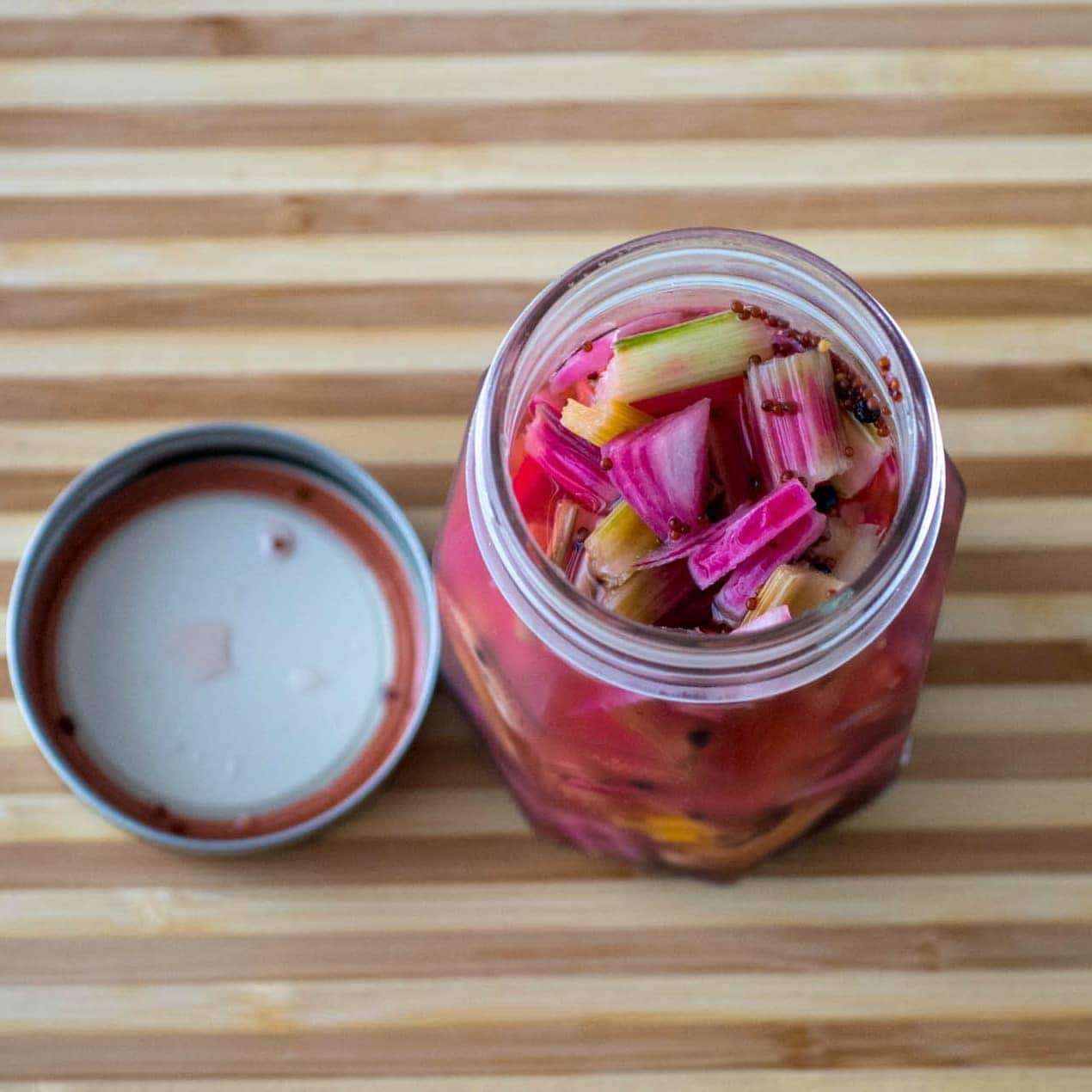 - Place the chard stems and onion in a pint mason jar, packing the vegetables tightly. Pour the warm brine over the rainbow chard stems and cap the jar.