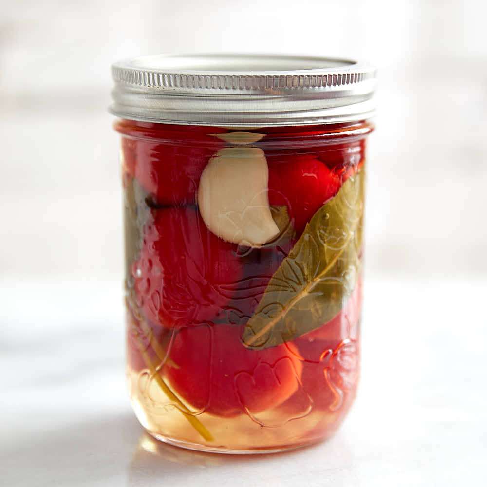 - Peel the garlic clove, cut it in half and add it to the cherry peppers along with the black peppercorns, cilantro and the bay leaf.